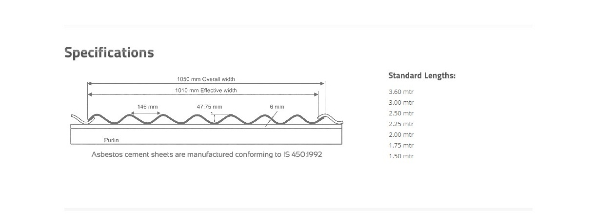 Grearoof roofing sheets embody optimum quality composition of the best quality portland cement and imported natural mineral fibres. A most stringent quality control system and unique manufacturing process has cemented Grearoof’s reputation as the most sought after roofing sheet brand in the market.Grearoof AC Sheets are highly durable, light, easy to work with and dimensionally stable, thus making them unique and functional for a wide range of uses.1. Houses at Village and hill area 2. Roof top for garage, small shop. 3. Roof top for warehouse and Godowns 4. Industrial building 5. Cattle Sheds 6. Poultry farm & Dairy farm sheds 7. Industries safe shelter 8. Bus station and Railway sheds